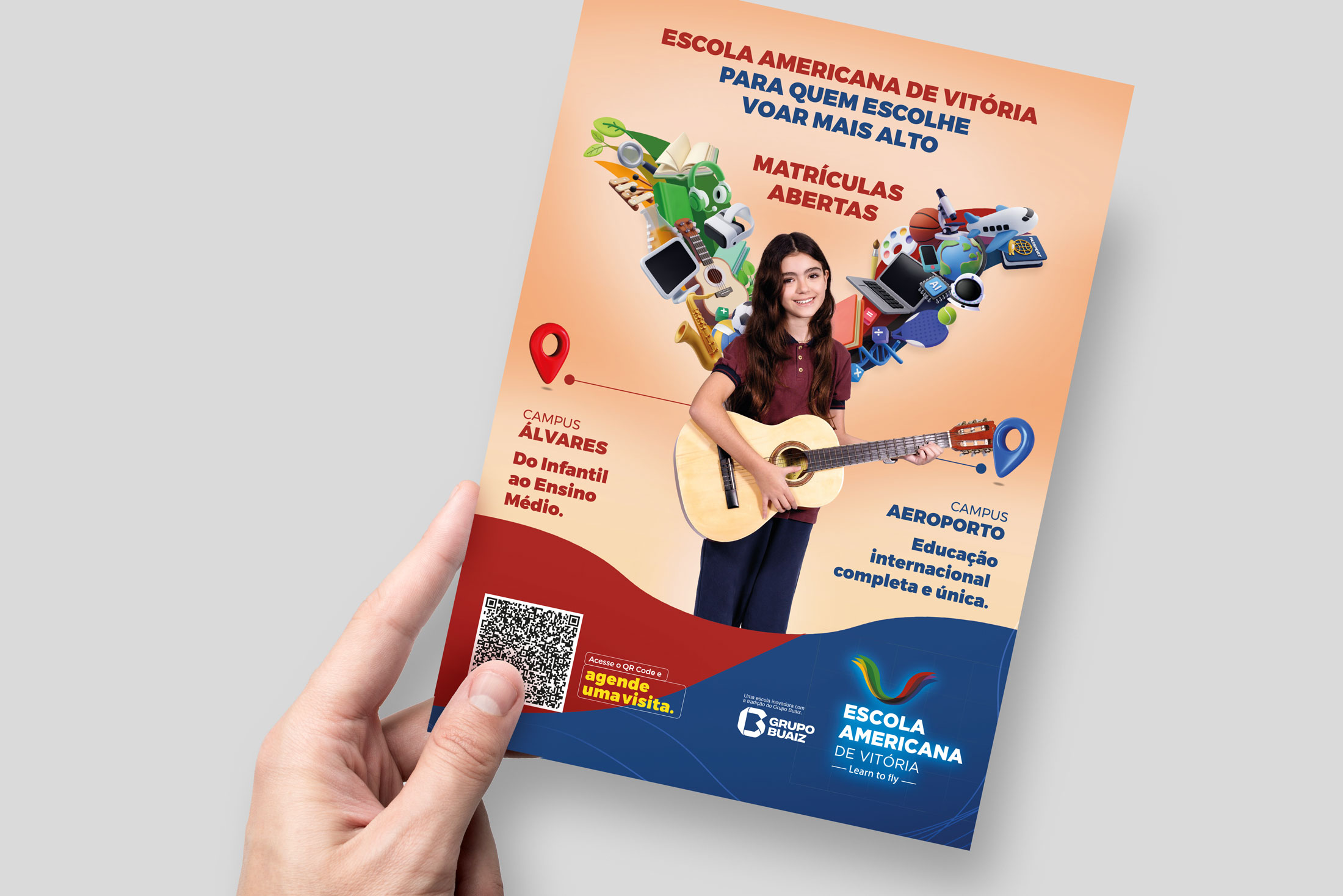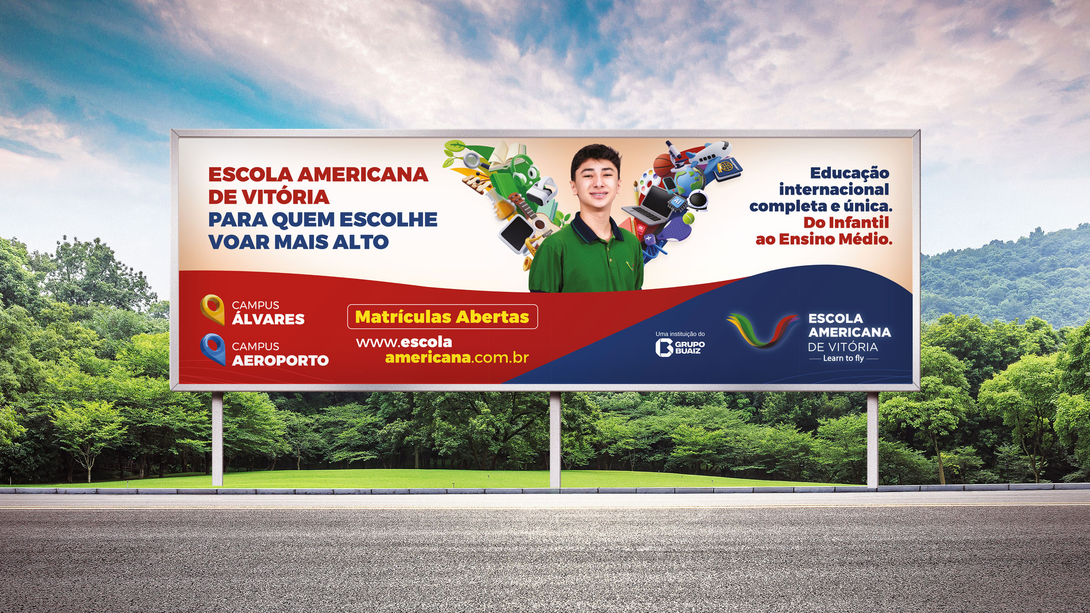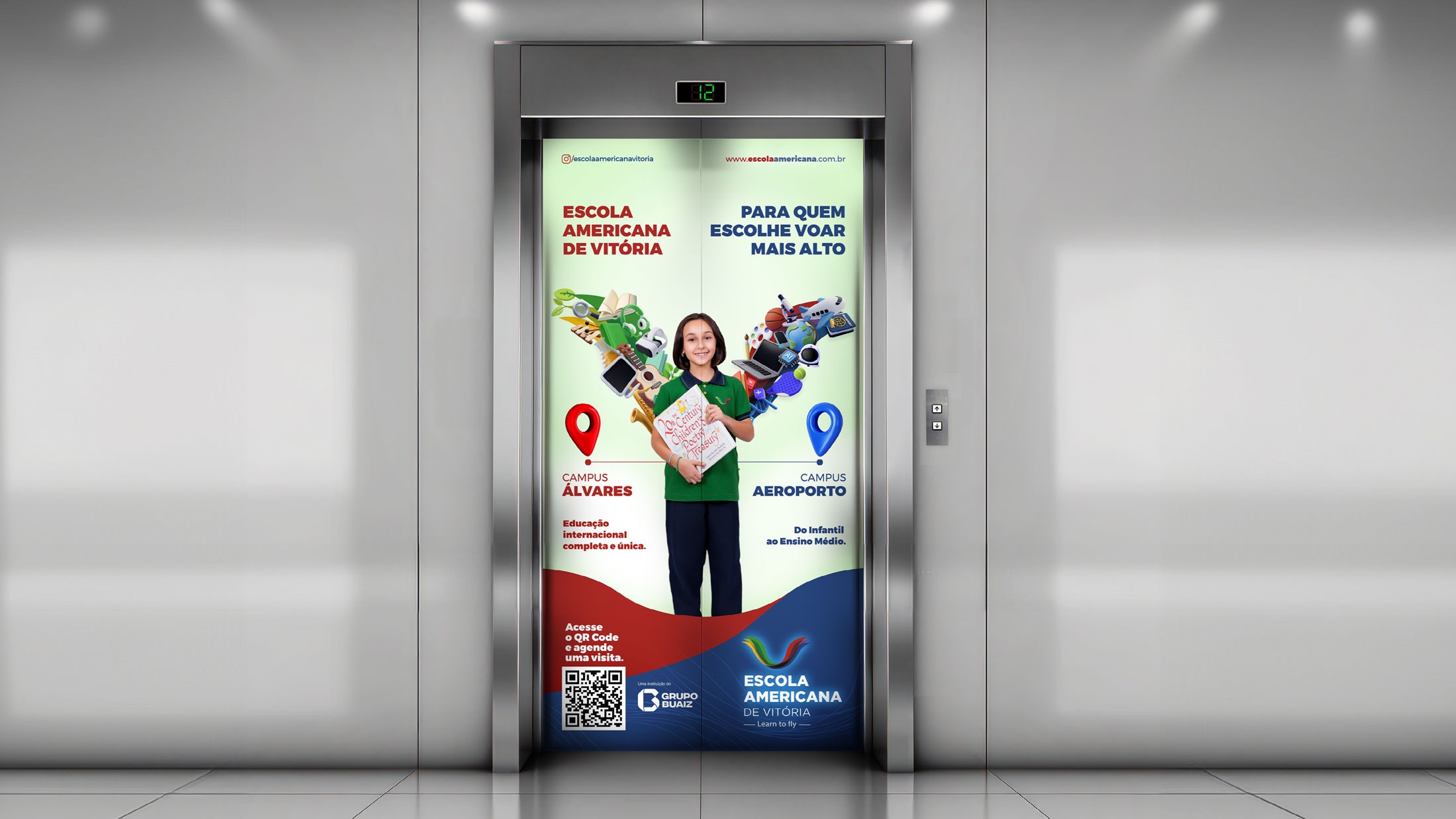 Após o sucesso da campanha de matrícula 2025, a Fire deu continuidade à comunicação da Escola Americana de Vitória com a campanha de 2026, agora destacando também o novo campus Aeroporto. Mantivemos as asas como símbolo de liberdade e sucesso e atualizamos as cores por turma, trazendo organização visual e destaque para cada segmento. Cada peça combina criatividade, coerência de marca e adaptabilidade, garantindo consistência, clareza e forte apelo visual, tornando a experiência de matrícula única, envolvente e conectada a este novo capítulo da escola.